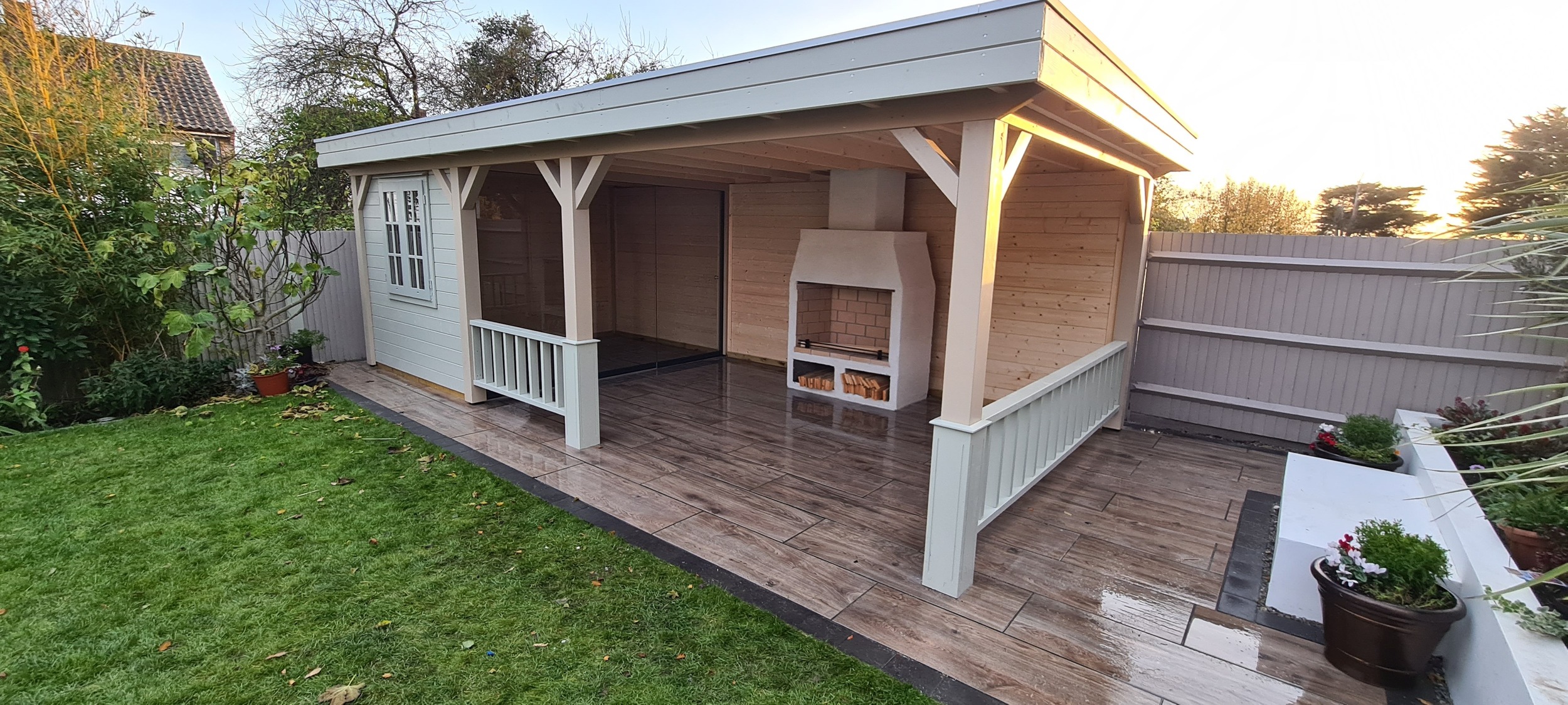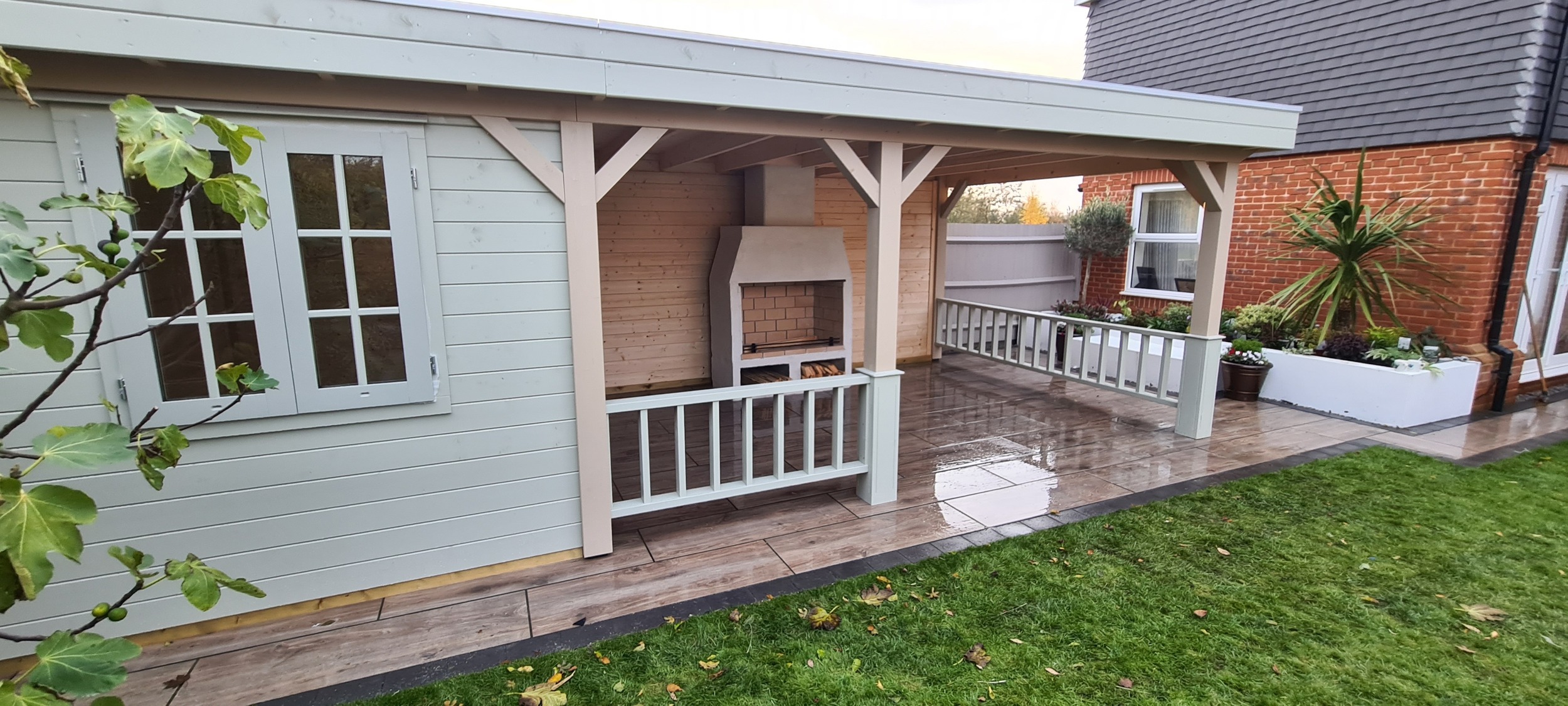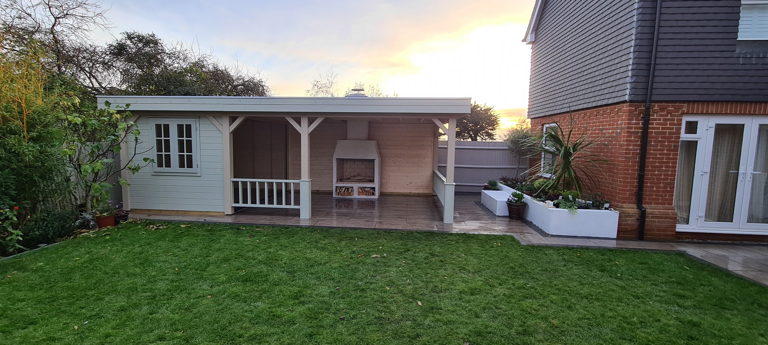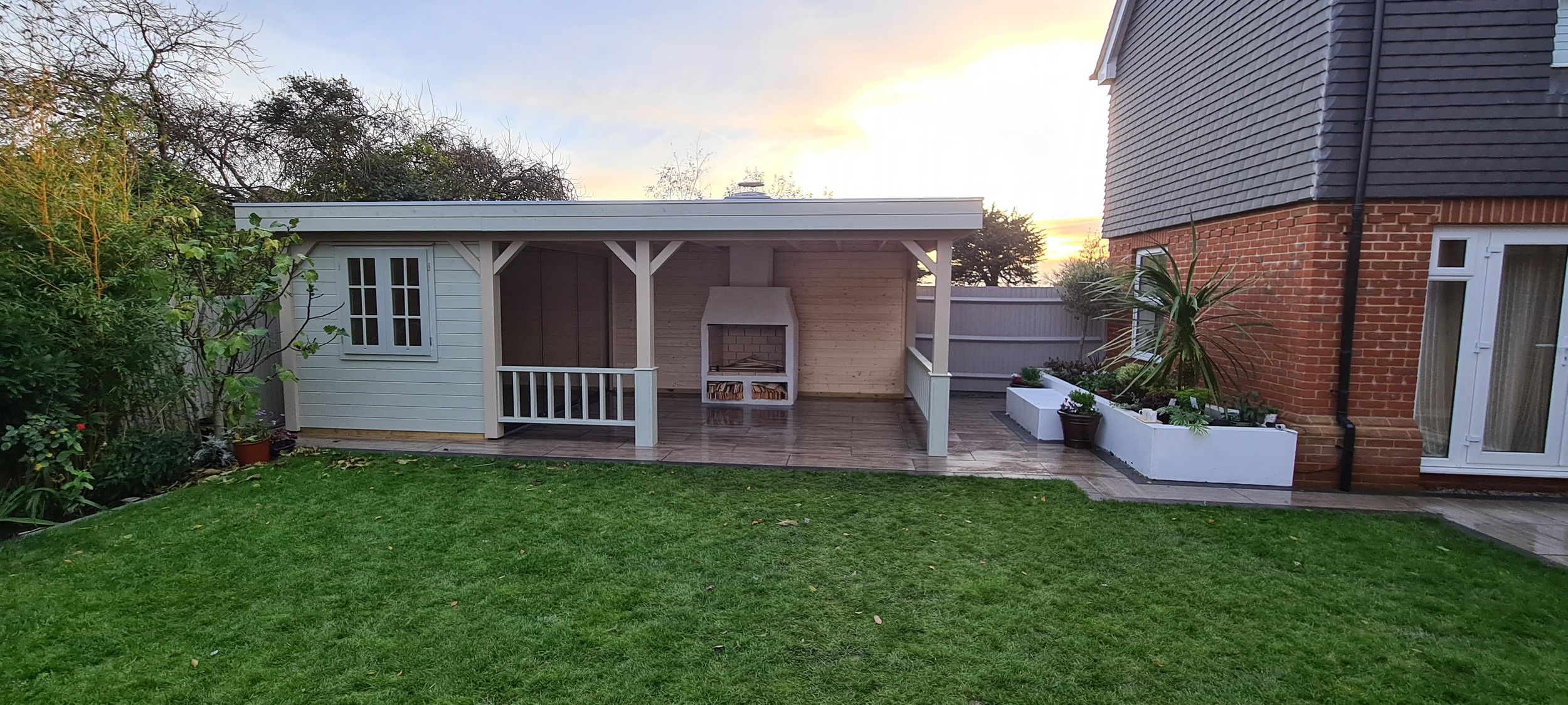 The veranda was thoughtfully designed to include a built-in open fire, which not only provided warmth on cooler evenings but also added an element of cozy ambiance to the outdoor space. Surrounding the fire, there was ample room for tables and chairs, allowing for a comfortable dining or lounging experience while enjoying the surrounding garden. The combination of the enclosed building and expansive veranda made the space adaptable for various occasions, whether it was a casual outdoor meal, a cozy evening around the fire, or a quiet retreat. The overall design aimed to create a harmonious balance between modern living and nature, offering a perfect place to unwind and entertain year-round.