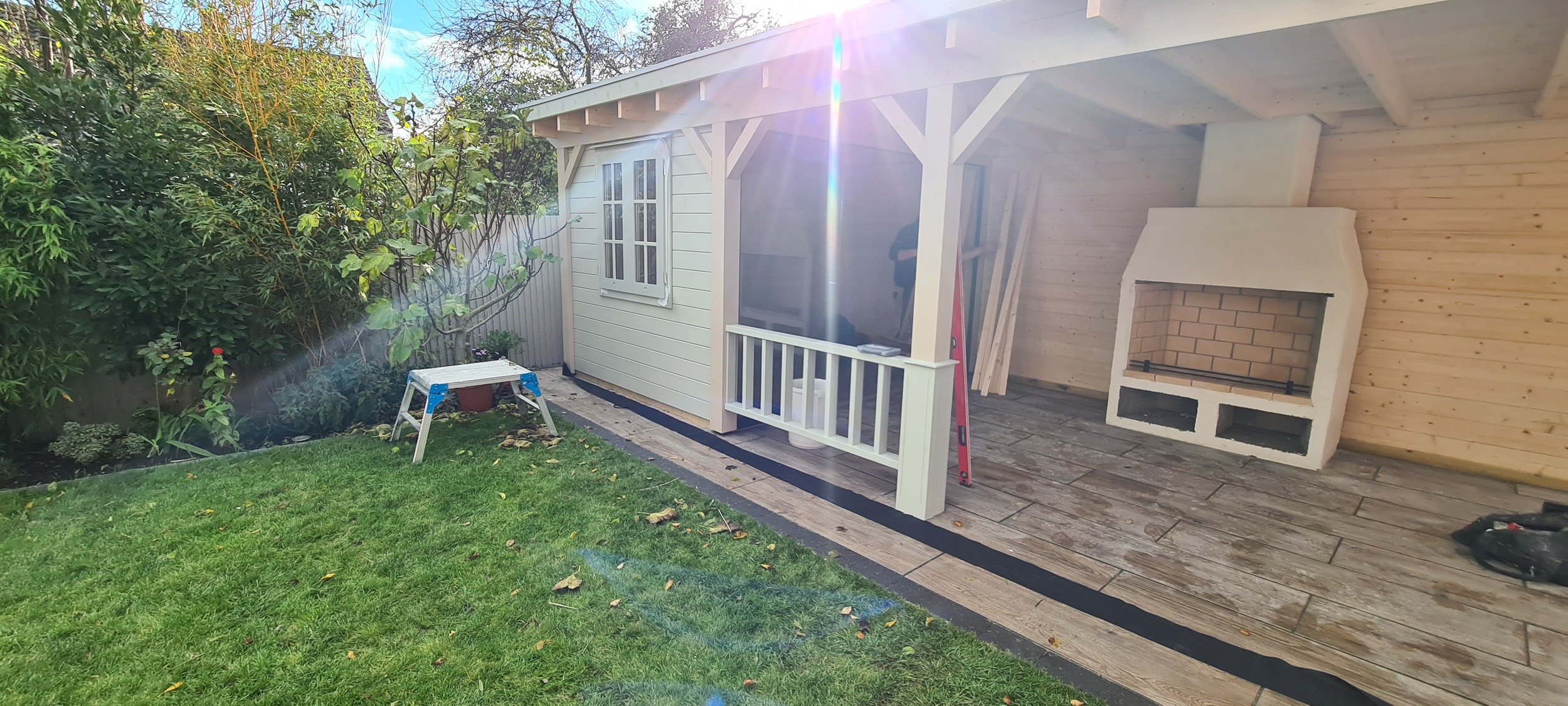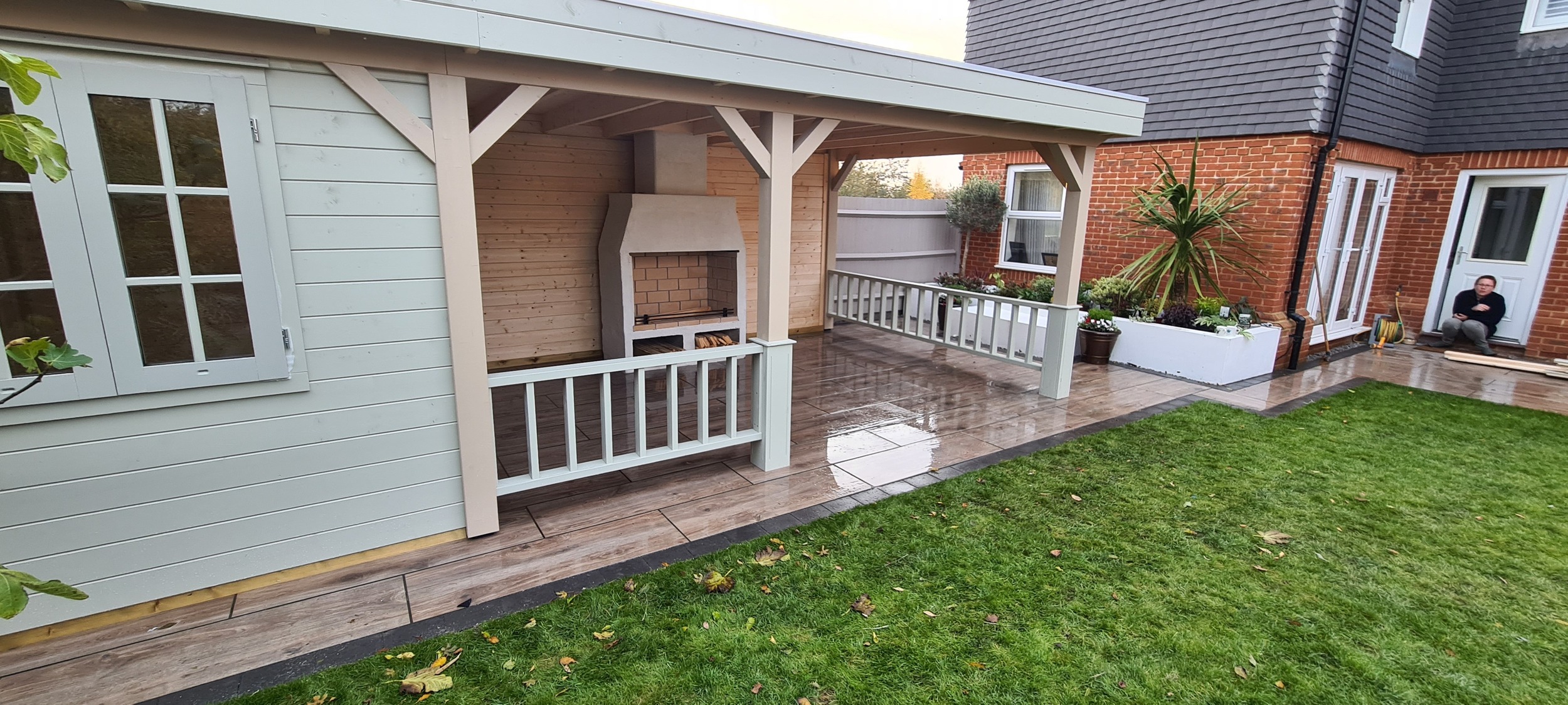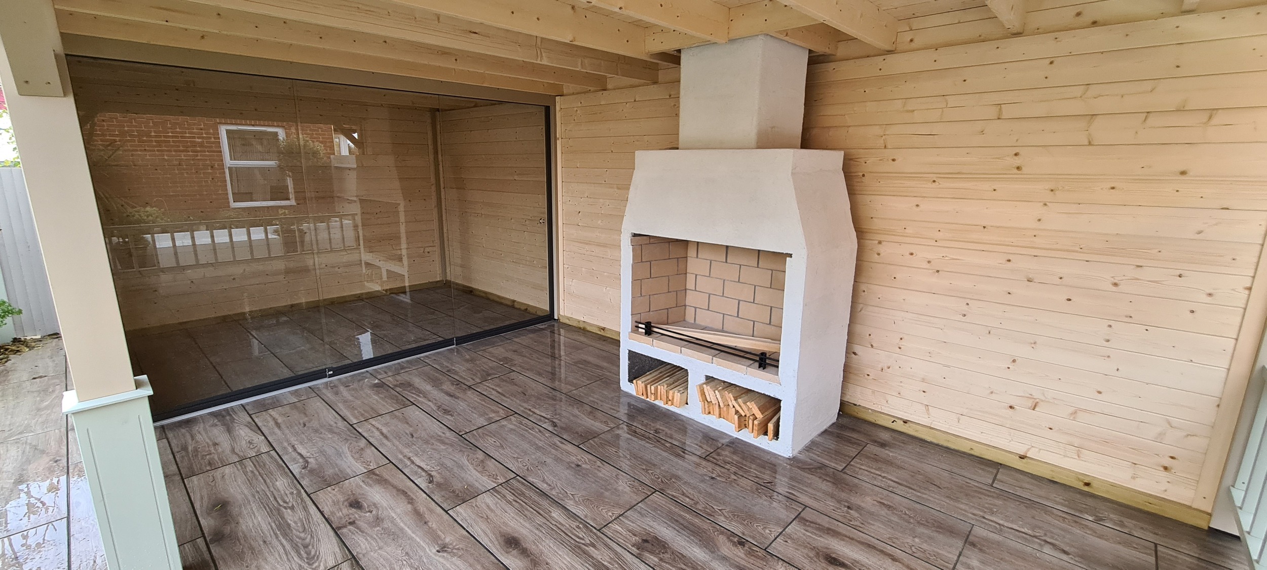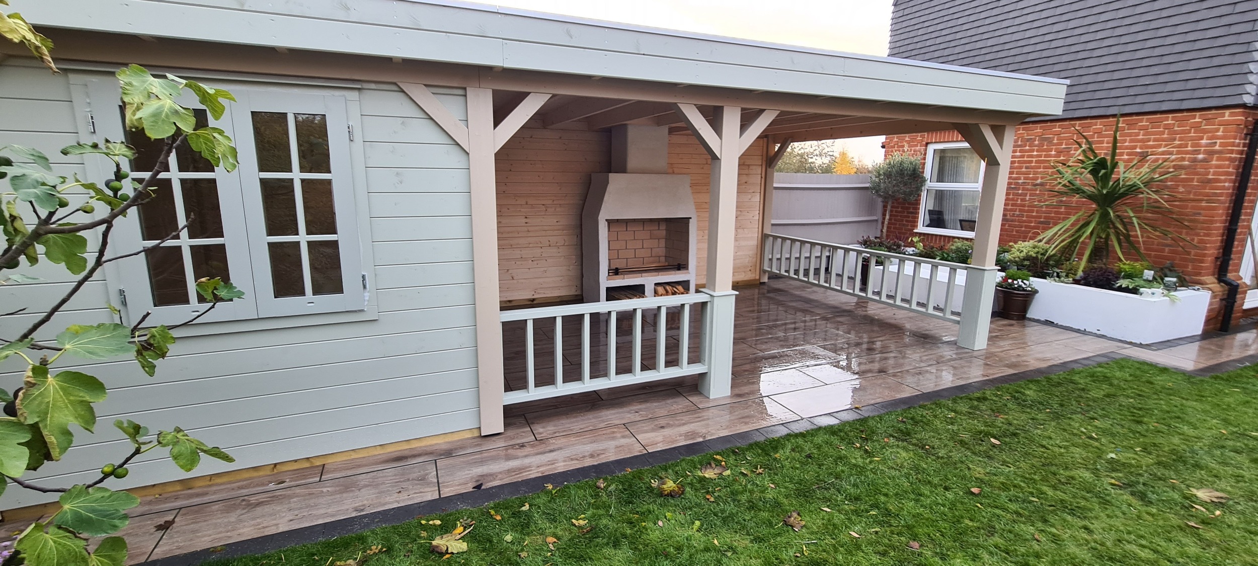 The veranda was thoughtfully designed to include a built-in open fire, which not only provided warmth on cooler evenings but also added an element of cozy ambiance to the outdoor space. Surrounding the fire, there was ample room for tables and chairs, allowing for a comfortable dining or lounging experience while enjoying the surrounding garden. The combination of the enclosed building and expansive veranda made the space adaptable for various occasions, whether it was a casual outdoor meal, a cozy evening around the fire, or a quiet retreat. The overall design aimed to create a harmonious balance between modern living and nature, offering a perfect place to unwind and entertain year-round.