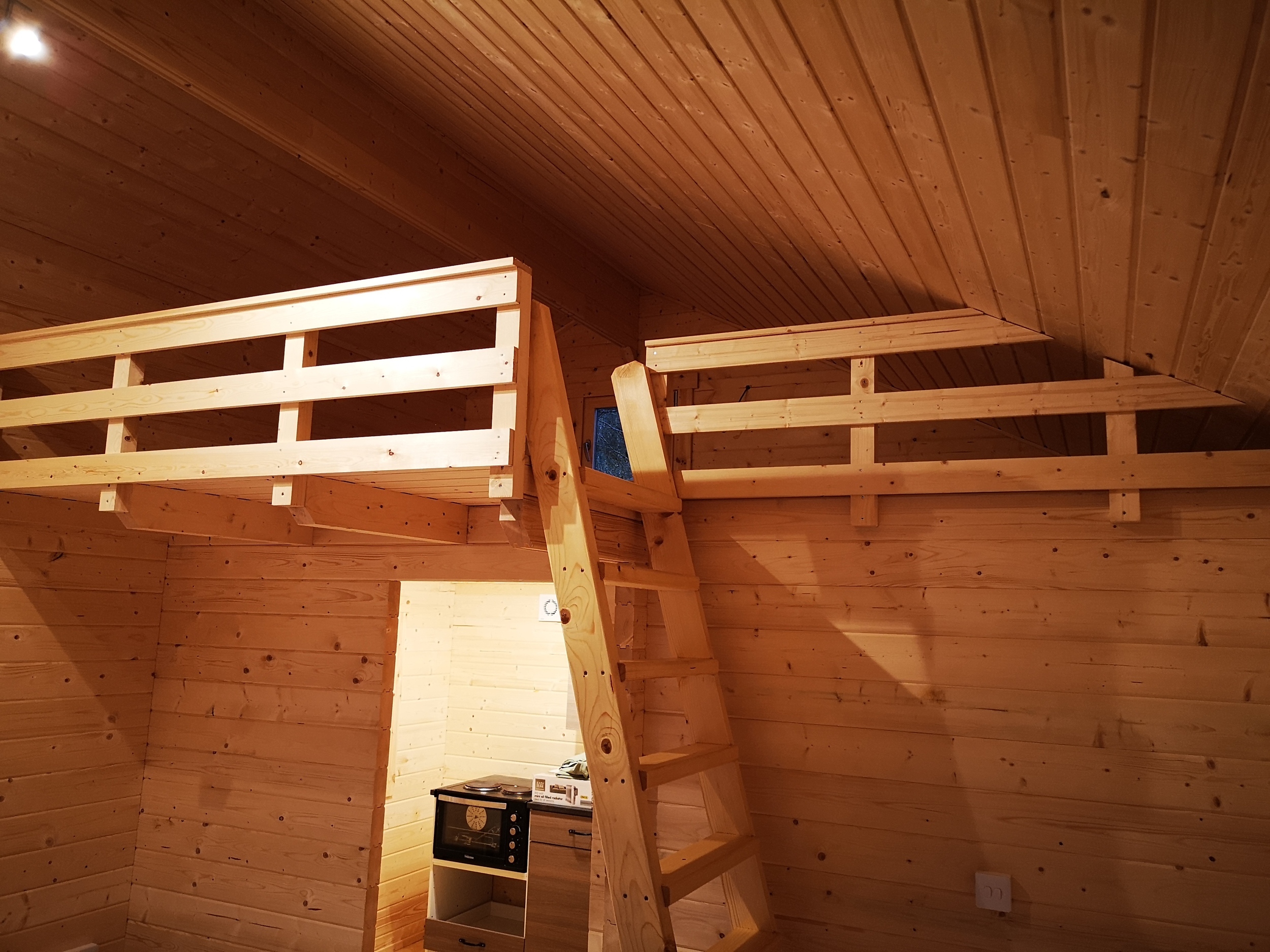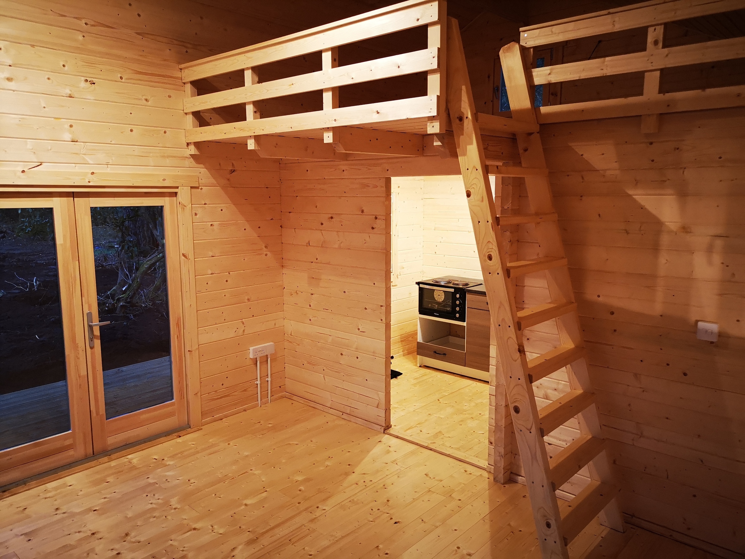 The cabin also featured a mezzanine floor, creating an elevated sleeping area that maximized the use of space while maintaining the cabin's intimate, cozy atmosphere. This sleeping area was accessed by a wooden steps and provided a comfortable retreat for guests to unwind after a day spent exploring the woodland. The use of natural wood finishes throughout the cabin enhanced its rustic appeal, blending seamlessly with the outdoor environment. The project aimed to create a peaceful, self-sufficient accommodation that offered both comfort and an immersive connection to nature, making it an ideal getaway for those seeking tranquility in the heart of the woods.