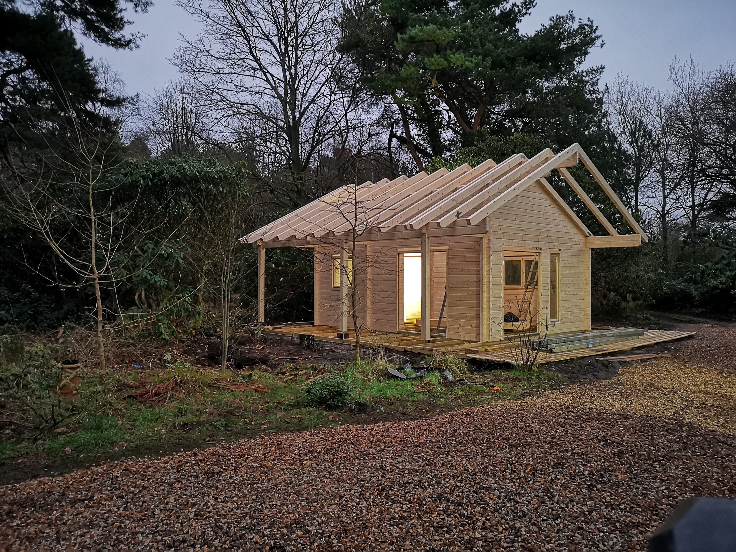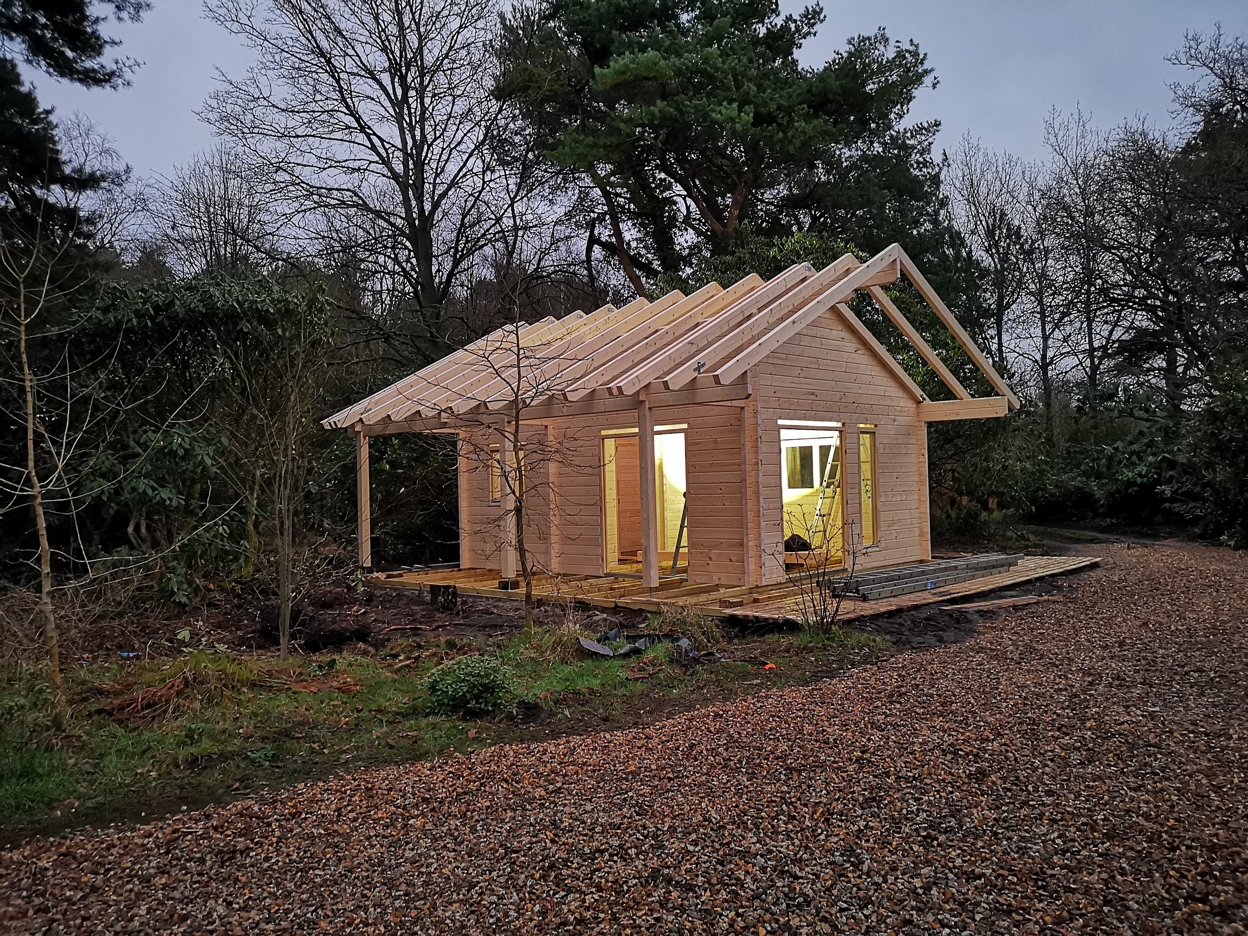 The project involved the creation of a 6m x 6m log cabin designed to provide occasional accommodation in a picturesque woodland setting. The cabin was intended to offer a cozy, self-contained retreat, combining rustic charm with modern conveniences. The ground floor was designed with an open-plan living area, featuring space for comfortable seating and a small kitchenette equipped with essential appliances for preparing light meals. A shower and toilet were cleverly integrated into the layout, ensuring the cabin was fully functional while maintaining a sense of spaciousness. The natural beauty of the surrounding woodland was emphasized by large windows that allowed plenty of natural light to flood the interior, providing guests with scenic views of the trees and forest beyond.